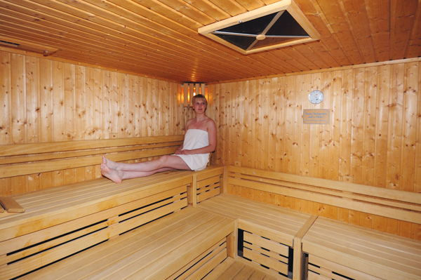 and is equipped with a salt water pool (29 °C),a Finnish sauna with light therapy and a steam bath, a shower section with rain dance and splash shower and a heated bench.